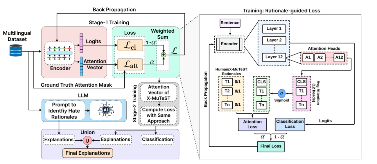 - Stage 1: Guides model attention using human-provided rationales.